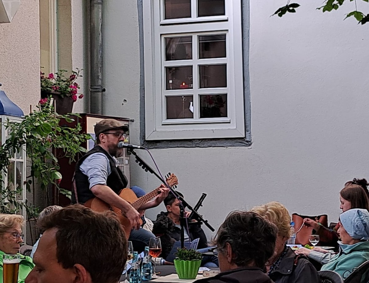 Diesem ersten Gottesdienst folgten bisher zwei weitere. So waren wir zu Gast in einem griechischen Restaurant. Dort feierten wir unter dem Thema ‚Griechischer Wein und himmlischer Segen‘ (Paulus auf dem Areopag). Der bisher letzte Gottesdienst fand abermals in der Weinstube statt. Er stand in Anlehnung an 1. Korinther 13 unter dem Thema ‚Nur die Liebe lässt uns leben‘. Die musikalische Palette reichte dieses Mal von Mary Roos über die Beatles (All you need ist love) bis hin zu Adel Talwil (Ist da jemand).